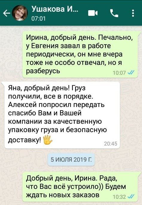 Посоветовал компанию товарищ (делал у вас заказ). Менеджеры Елена Геннадьевна и Юля работают замечательно. Были решены задачи с поиском товара и его доставкой. Вожу хоз.товары, всегда приходит в срок.